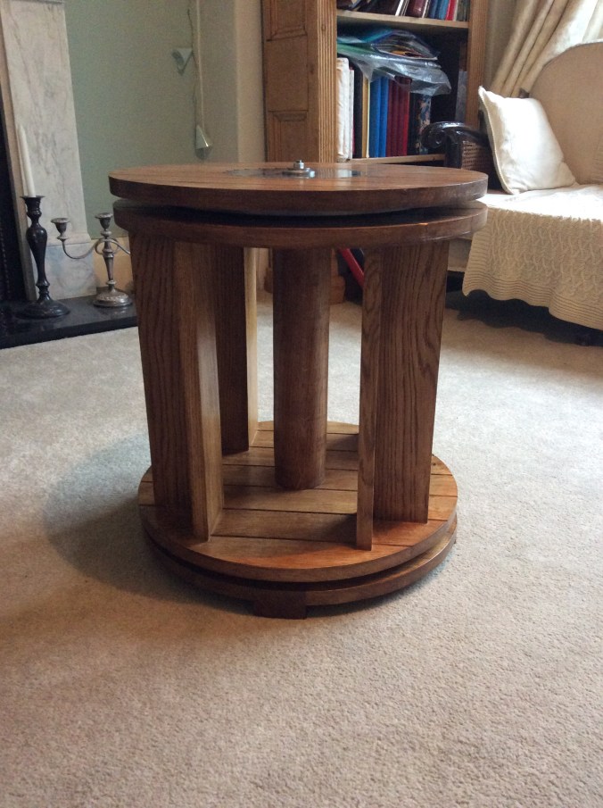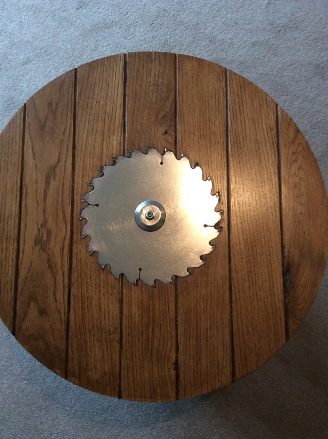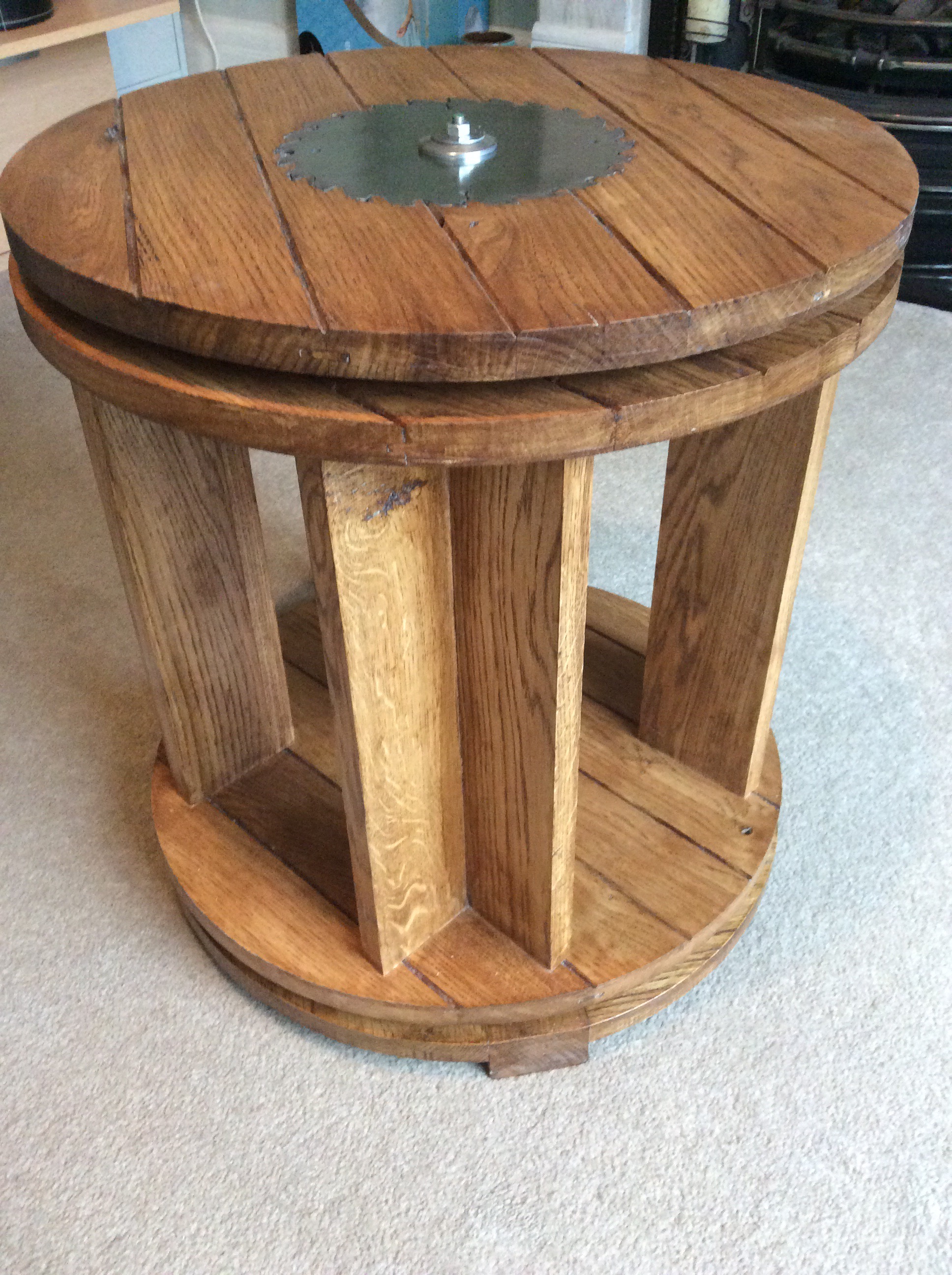 Is it a bookcase? is it a table? No it’s a twister……. well, spinner actually. Just finished this spinning bookcase come table for a very good friend. Incorporates a scaffolding foot for the central spindle, a decorative chop saw blade and two lazy Susans. It was nice to do some lathe work for a change. Hope she likes it!!!